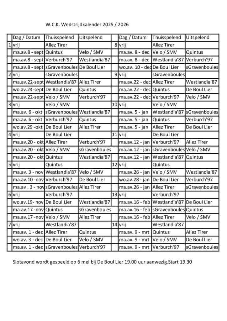 Tijdens de competitie van de Westlandse Club Kampioenschappen strijden de fanatieke leden van De Boul-Lier én andere jeu de boules-verenigingen uit de regio om de felbegeerde titel. Met een vaste boules-maat speel je in totaal 14 speelrondes uit en thuis.